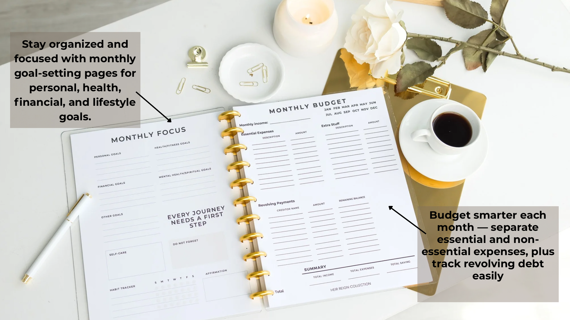 Check out our beautifully designed 12 month undated planner—perfect for any season, any schedule. Choose from vertical or horizontal weekly layouts to match your planning style. Includes monthly and weekly spreads, financial budget sheets, goal-setting pages, habit trackers, and more to keep you focused, motivated, and in control.